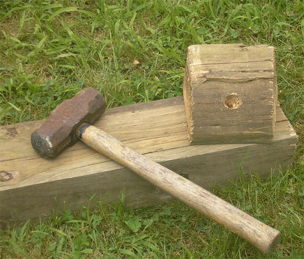 | I used spare pieces of the 4" x 6" beams to mount the stakes. First I drilled a hole and then used a sledge mallet to hammer it securely into the wood. The stakes themselves are cold rolled solid steel and are 1 inch wide and 30 inches long. By regulation, the stakes need to be angled 10 degrees forward (toward the other pit). | ||
