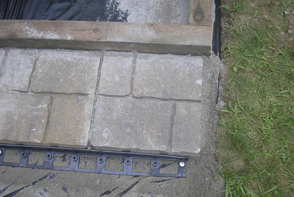 | Another shot of the patio bricks on the leveling sand and secured wit the plastic and spikes. | ||